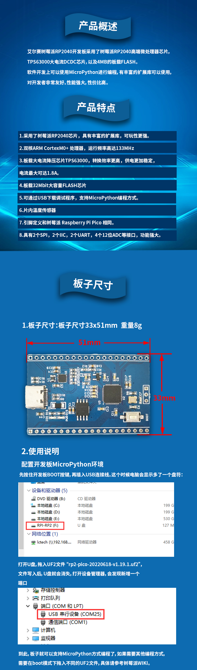 树莓派RP2040开发板 32Mbit FLASH RP2040双核处理器 Micropytho